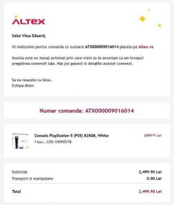 „Abia după ce am plasat comanda, pe site, pe pagina produsului PlayStation5 a apărut un banner care spunea că, de fapt, nu am cumpărat consola (deși e-mail-ul de confirmare cât și statusul comenzii spune altceva) și că vom participa la o tombolă pentru ea”, scrie păgubitul pe pagina de Facebook.